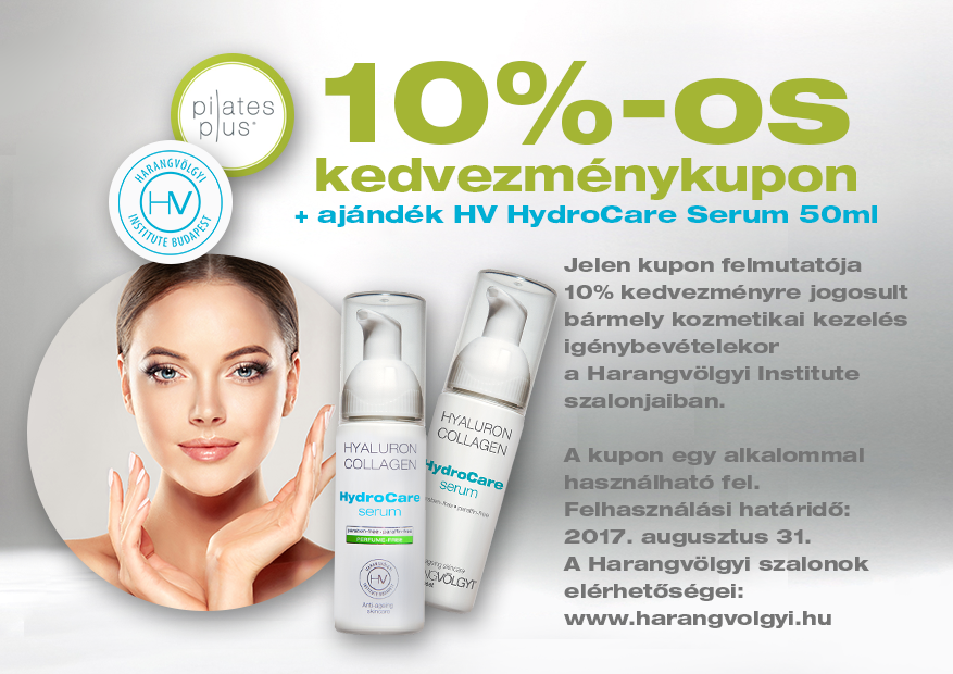 A nyári hónapokban közös promócióval jelentkezünk régi partnerünk, a Harangvölgyi Insitutettal közösen. Egyéni vagy páros gépes pilates bérlet vásárlása esetén egy Harangvölgyi HydroCare Serumot, valamint Harangvölgyi kezelésekre felhasználható 10%-os ajándékkupont adunk vendégeinknek.